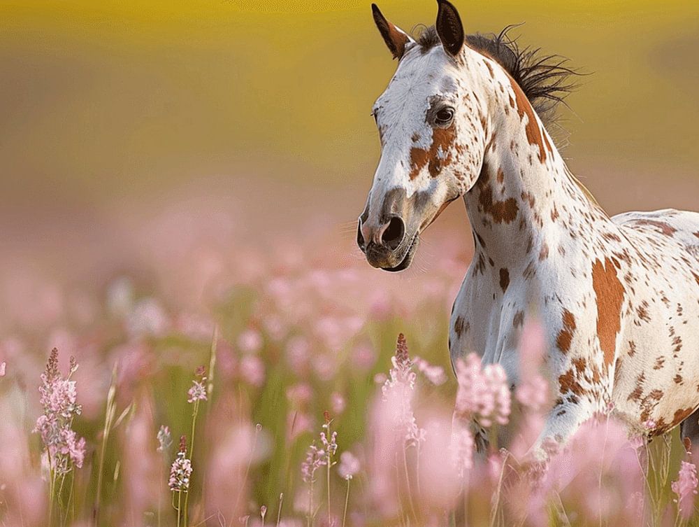 Experience the enchanting beauty of the horse in a natural setting amid fields of flowers, captured in breathtaking photography. Get carried away by the elegant poses and vibrant colours surrounding this majestic stallion, and feel the power of its natural splendour.