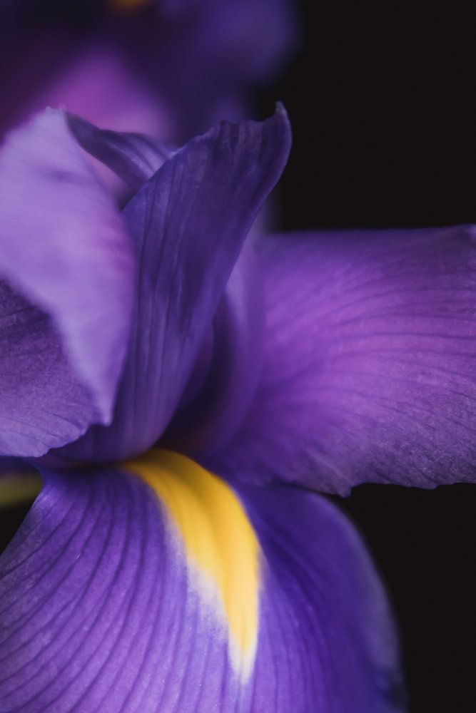 This photographic artwork captures the majestic beauty of a purple Iris. The deep purple petals, with their velvety texture and graceful lines, exude elegance and strength. The play of light and shadow enhances the delicate details and vibrant colours, bringing the flower to life. This work of art highlights the graceful and striking appearance of the Iris, harmoniously merging nature and art.
