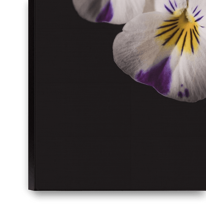 This photography artwork depicts two delicate white-purple violets, which draw immediate attention with their sophisticated colour combination. The flowers, with their soft white petals and vibrant purple accents, exude a natural elegance. The light subtly plays with the textures and shapes of the violets, showing off their fragile…