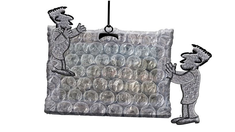Bubble wrap wrapping a piece of fine art being moved by bubble wrapped removal characters.