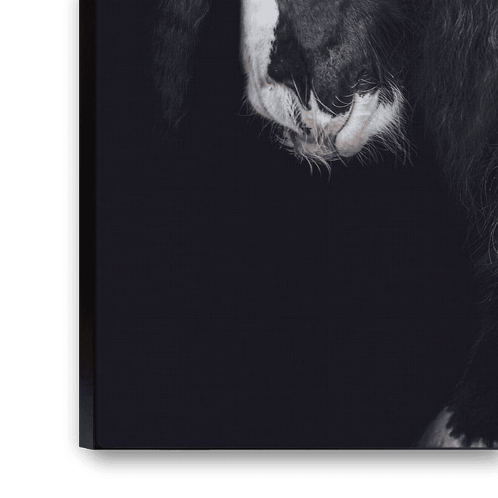 This beautiful Fine art portrait graces any wall! This Tinker horse is beautifully photographed 'en profil', making the long mane and front pluck clearly visible. The black and white of the horse in combination with the black background gives the photo a fancy look and the horse stands out beautifully. A true work of art for any wall! This photo can also be perfectly combined with the other fine art photos of this horse in this series.