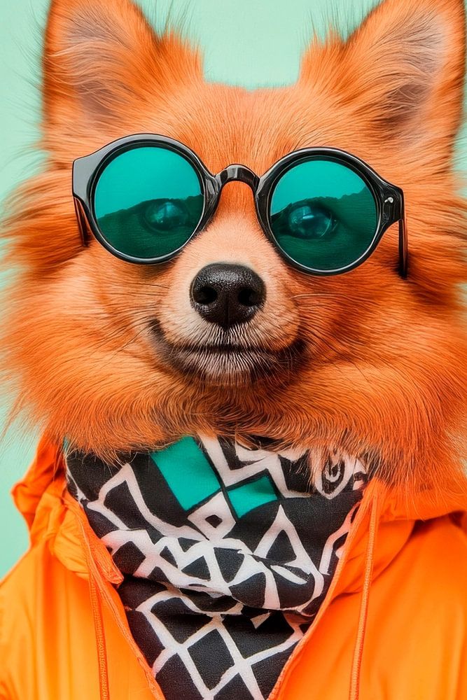 The lively appearance of a Finnish Spitz shines out against a pastel green background. With its bright orange fur and striking, fox-like ears, it conveys an air of friendliness and energy. The stylish sunglasses and colourful bandana give him a playful, modern twist - a true trendsetter on four paws!