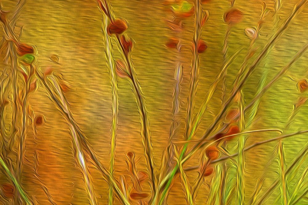 A splash of white can be seen on the right of the image, from a ray of bright sunlight, just like to the left of center in the image. The brown buds are mini-leaves, although in my work they look like small flowers.