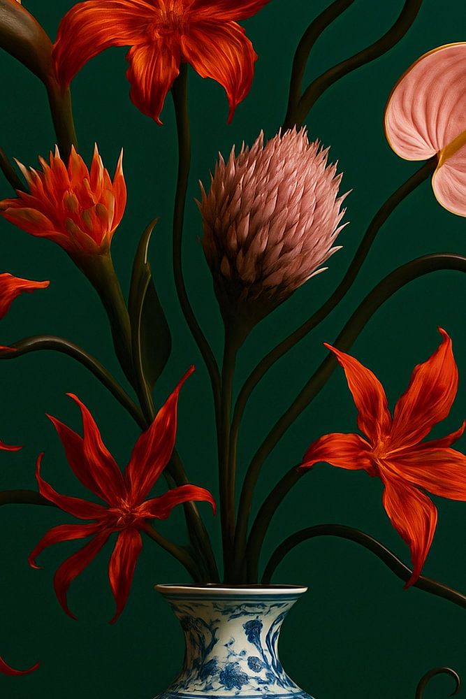 Expressive still life with fiery flowers in a classic Delft blue vase. A bold, elegant eye-catcher for an interior with character and warmth.