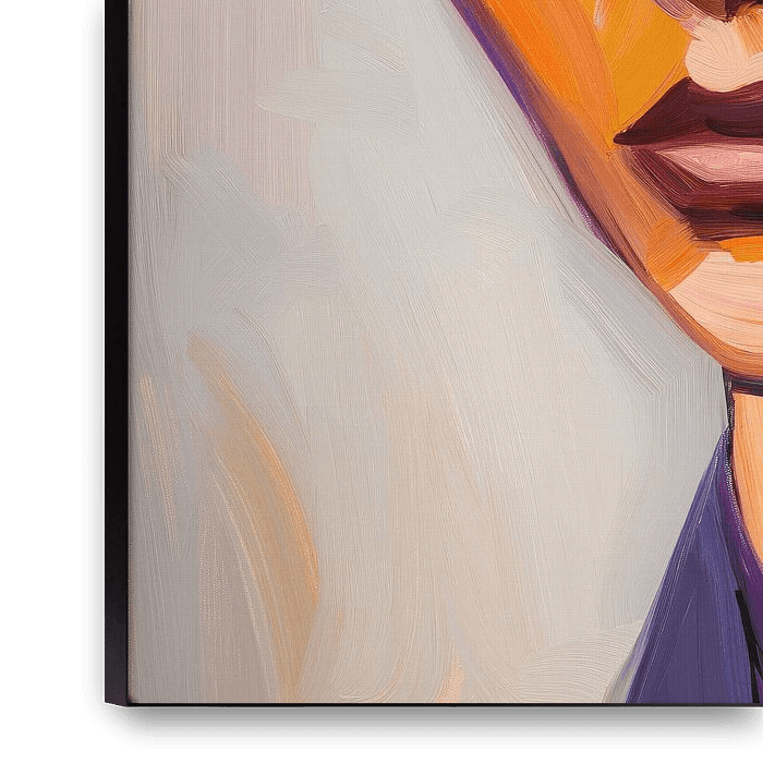 Fire of Expression is a powerful portrait in which emotion and colour merge into an intriguing whole. The woman's intense gaze, sharp and penetrating, is enhanced by the expressive brushstrokes and vibrant colour combination of warm orange tones, deep purple tones and subtle accents of gold. This contrast between warmth and shadow…