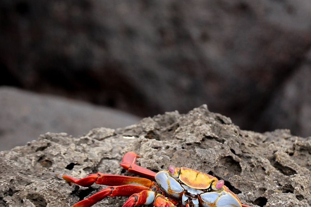 The sharp, vivid subject contrasts with the softly blurred background of stacked, dark volcanic rocks. The photo highlights the unique, striking colours of this crab, which is an indispensable part of the islands' ecological picture.