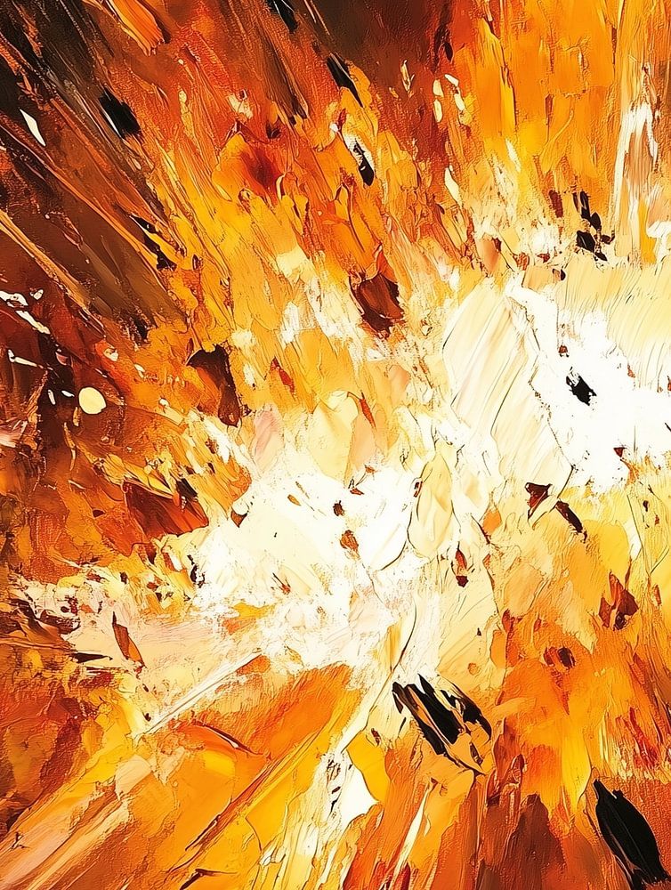 This painting shows a radiant ball of fire erupting from a central point. The colour palette of yellow, orange and black enhances the drama of the scene. The dynamic brushstrokes add texture and depth to the painting, making the explosive energy visually palpable. This work is ideal for spaces that want to create an intense and energetic ambience.