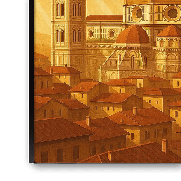 This Firenze Art Deco poster pays tribute to the Renaissance capital of Italy, highlighting the majestic Duomo di Firenze with its iconic red dome and striking bell tower. Rendered in warm golden hues, the design evokes the charm of vintage travel posters, blending timeless elegance with bold geometric Art Deco influences. Florence, known for its artistic legacy, is beautifully represented here with sunbeams radiating over terracotta rooftops, symbolizing creativity and cultural richness. This illustration is perfect for adding a sophisticated Italian atmosphere to any interior, from modern apartments to traditional spaces. Art lovers, history enthusiasts, and travelers alike will appreciate its refined balance of color, architecture, and nostalgic style. Whether as a statement piece in your living room, an inspiring accent in your office, or a thoughtful gift, this Firenze wall art celebrates the enduring beauty of Tuscany’s most famous city.