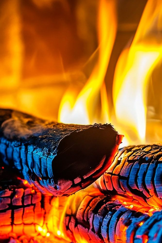 A warm play of light dances vividly between crackling logs, while the embers glow softly in red-orange tones. The seductive scent of burning wood fills the air and a feeling of cosiness spreads. The flames lick playfully at the edges of the logs and create an atmosphere full of cosiness and warmth.