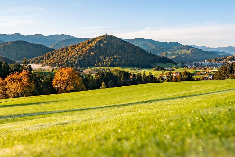 First rays of sunshine in autumn with a view of the Hochgrat, Staufen and Oberstaufen