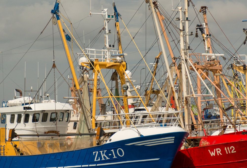 The sun breaks through the clouds the fishing boats in the harbour. Moored at the jetties. The wind can be heard through the trees on deck. The threatening clouds the blue hulls and the fiery red cutter standing out.