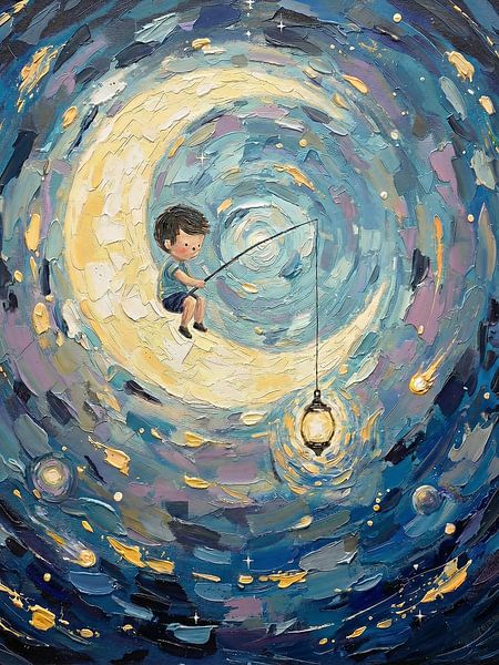 In Fishing for Light, a little boy sits on the moon, rocking gently in a whirlpool of pastel colours. With his fishing rod, he reaches for a small, glowing lamp, as if trying to catch light, hope or a dream. The playful brushstrokes and soft shades of blue, yellow and lilac create a safe, imaginative world where silence and wonder come…