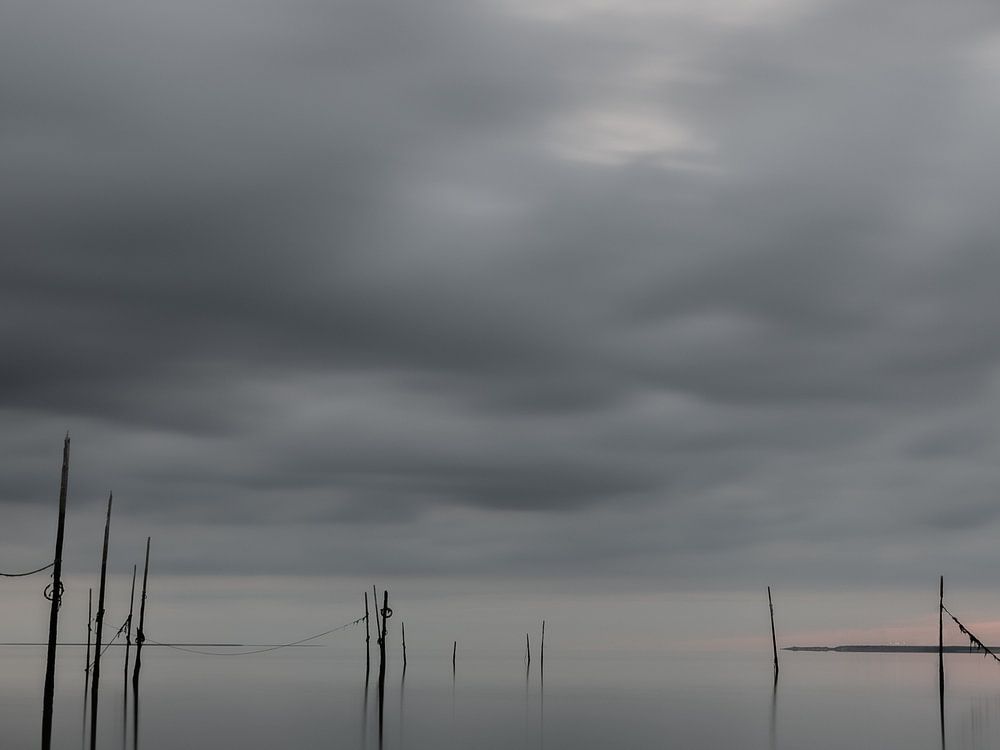 At the end of the day the light became soft, the wind had died down and there was still some colour in the distance.To create a calm image, the exposure was extended and as it was almost windless, the fishing poles remained nice and sharp.