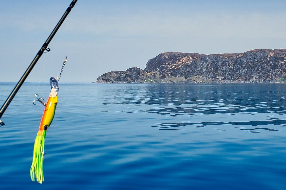 Fishing rod in front of the West Cape in the Norwegian fjord landscape. Crystal clear water in Scandinavia