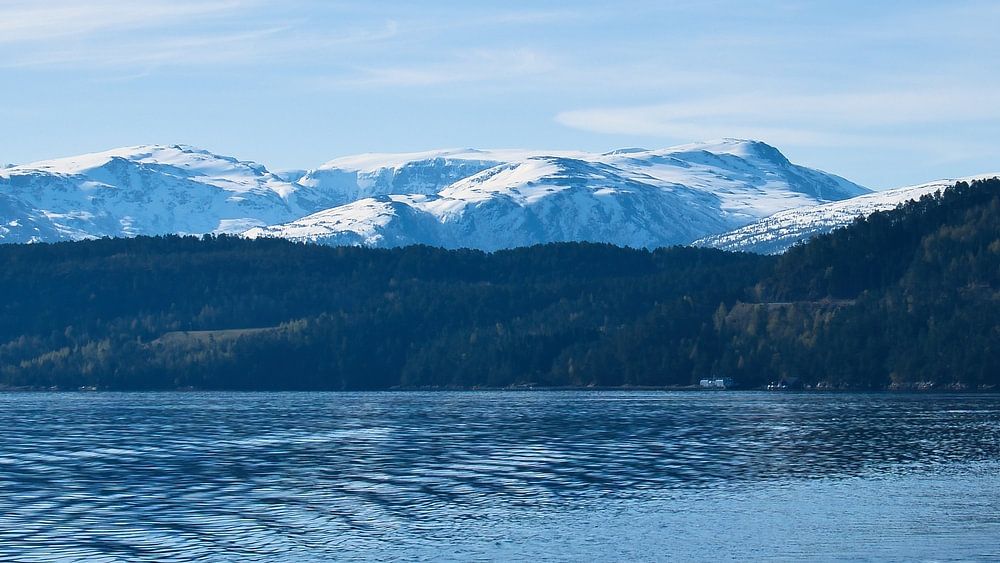 Fjord in Norway. Fjord and sea with mountains and blue sky on the coast. Rough nature in Scandinavia