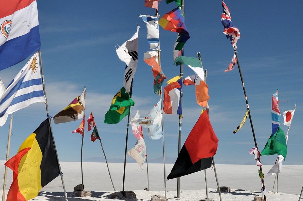 Flags from various countries fly proudly in the middle of the salt desert of the Salar d'Uyuni, creating a striking contrast with the white immensity of the landscape. A symbol of global unity and diversity.
