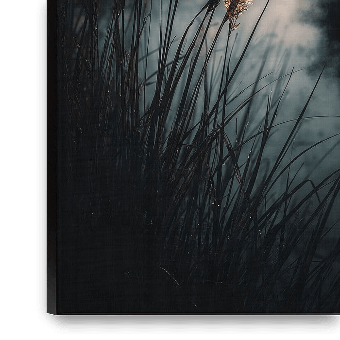 In the soft twilight, golden reed stalks blaze like small fires in front of a mysteriously misty moorland lake. The delicate drops on the stalks glisten, while a distant orange-coloured point of light breaks through the horizon. This atmospheric fine art synthography in a dark cinematic style combines mysticism, tranquillity and the…