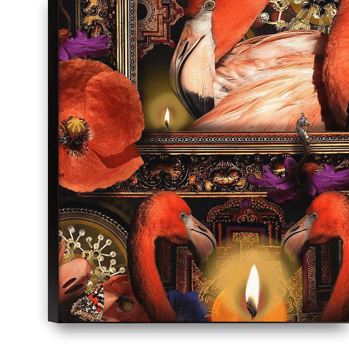 This work 'Flamingos and poppies' is a digital creation by the artist that combines different elements to convey a message. The poppies symbolise impermanence, the fragility of their existence. They are bright red, but also fragile and ephemeral. They remind us that life is precious and fleeting. The flamingos represent beauty, grace…