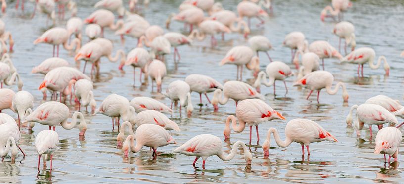 Pink flamingos (Phoenicopterus roseus) in the shallow water of a lagoon in the Camargue, France.