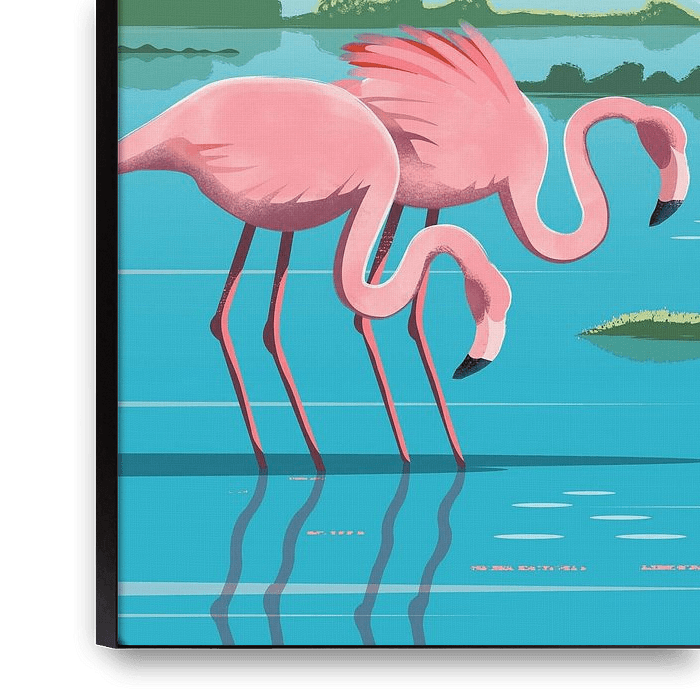My illustration shows the colourful flamingos at Pekelmeer in Bonaire. This area is a natural saltwater lagoon, where flamingos wade through the water, their vibrant pink plumage contrasting beautifully with the white salt flats in the background.