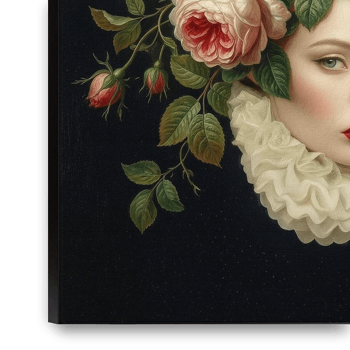 A surreal collage that combines a modern portrait of a woman with classic elements of the old masters, such as 18th-century flower still lifes and a traditional collar.