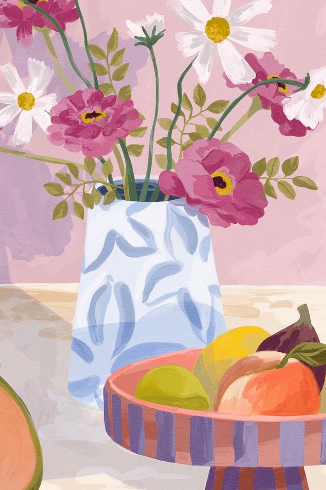 Atmospheric still life in summer colours, with a beautiful bouquet of wild flowers in a modern vase. Next to it is delicious summer fruit, melon, lemons, peach and fig. The warm colours immediately put you in a Mediterranean country.
