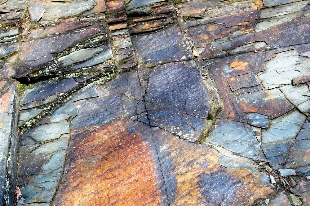 Full colours in natural stone, the well-known flexstones, along the banks of the Barrage de la Gileppe reservoir in the Belgian Ardennes.