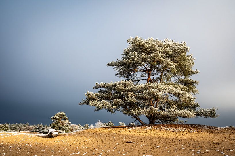 A beautiful winter landscape photo of a free-standing flying pine on a sand drift on the Hondsrug in Drenthe. In the background, a threatening sky with (snow) showers. The frosted Scots pine and sand drifts are beautifully exposed by the sunlight that showed itself for a few seconds.