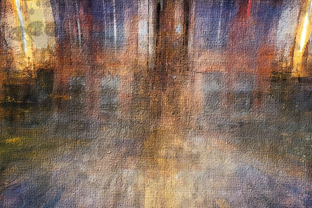 Flight at Night is an abstract modern painting that focuses on movement, emotion and light. The artwork evokes the feeling of a nocturnal flight through an urban landscape, where reflections of street lights and architecture blur into dynamic vertical lines. The coarse brushstrokes and thick texture give the painting a powerful,…