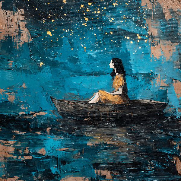 A mesmerizing abstract portrait of a girl sitting in a floating boat beneath a sky of falling stars. This expressive acrylic painting features thick palette knife textures and painterly brush strokes, creating a surreal, dreamlike atmosphere. Perfect for wall art, this piece evokes solitude, wonder, and cosmic beauty. Ideal for…