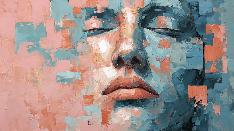 A mesmerizing abstract artwork featuring a floating human head formed from fragmented shapes, gently drifting apart while emitting a soft glowing light from within. This piece symbolizes inner emotion, identity, and the complexity of the human mind. Created in an expressive abstract textured acrylic painting style, it showcases thick…