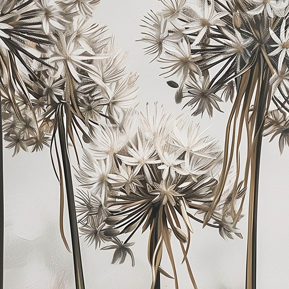 Serene rendering of dandelions in seed stage, with the fluffy bulbs gently contrasting against a light, hazy background. The stems are rendered slender and simple, giving full focus to the airy structure of the seed heads. The white and grey tones of the tufts create a sense of lightness and movement, as if the seeds could be carried away by a gentle breeze at any moment. The background, with its subtle blurring and pastel shades, enhances the ethereal and calming nature of the work.