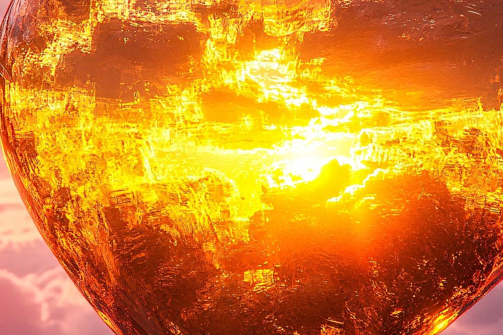 A beautiful and surreal design featuring a glowing golden heart floating in the sky, surrounded by a spectacular background of colourful clouds. This artwork exudes warmth, love and magic, perfect for decorating any room. The playful contrast of the shimmering heart against the sky creates a dynamic and unique effect. Ideal for lovers of modern and abstract art.