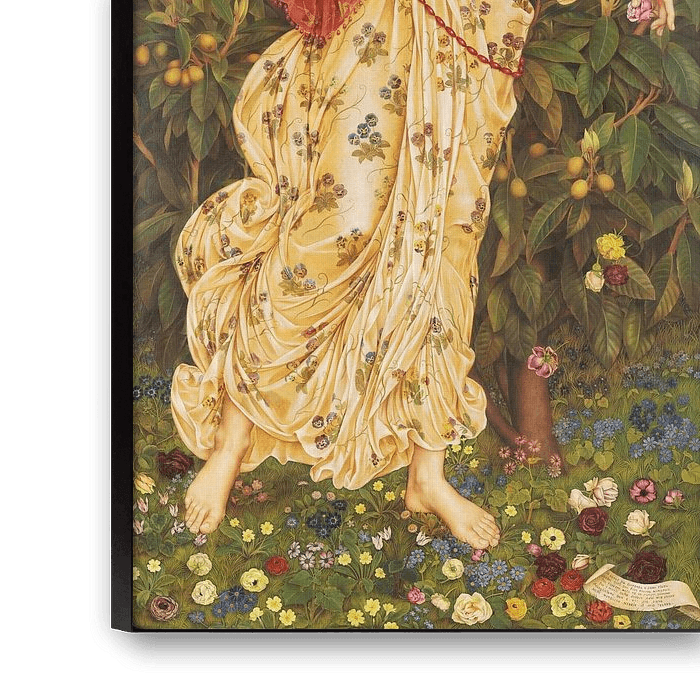 Flora is depicted in front of a Nescola or Loquat tree which bears fruit in the spring. Little birds, such as Chaffinch and a Siskin can be identified within the tree. Flora’s robe is patterned with Florentine flowers and blossoms drop from her clasp and lie scattered in front of her feet.