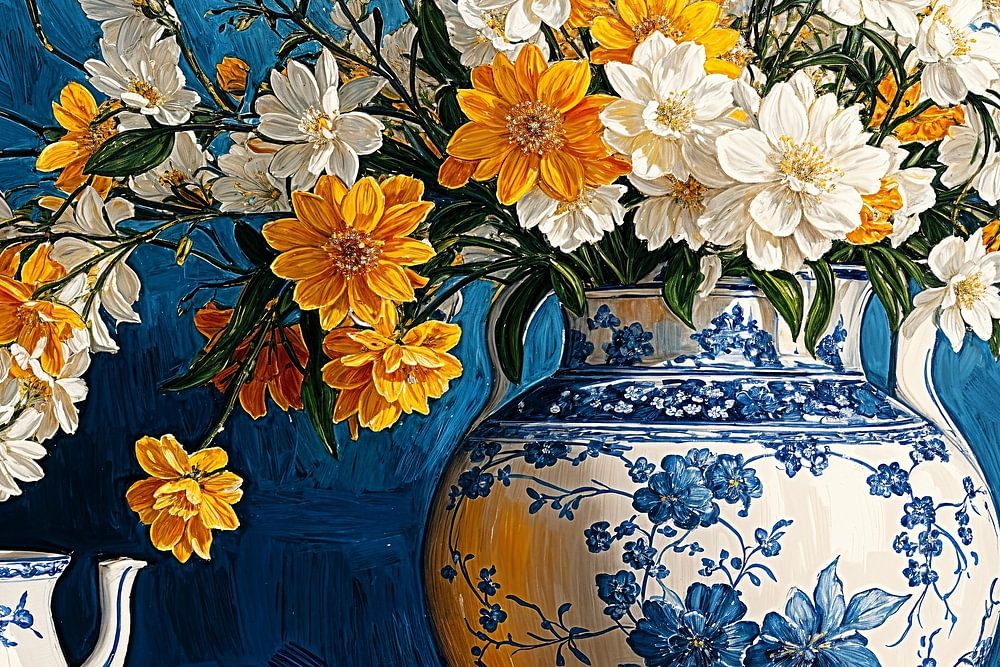 This artwork shows a colorful and vibrant arrangement of flowers in an antique vase, surrounded by oranges and a small pitcher. The warm tones of yellow and orange contrast beautifully with the cool blue background, creating a sense of calm and balance. It radiates joy and wonder at the beauty of nature.