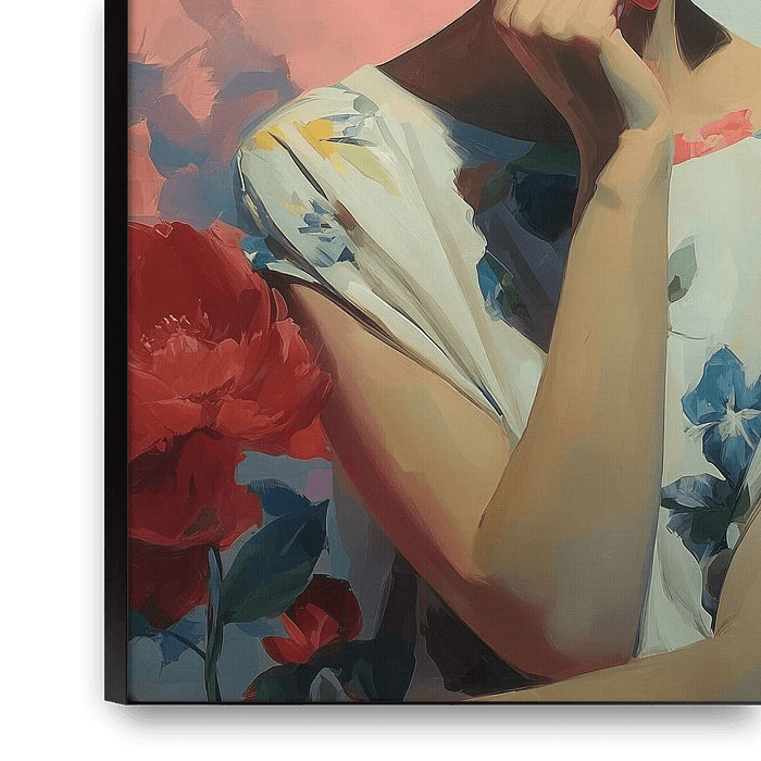 A meditation in paint and color: a woman wearing a lush flower crown gazes into space, her finger to her lip. The artist works with a warm palette of coral, red, and cobalt, in which imposing peonies and silk flowers merge with skin and fabric. This work exudes a nostalgic elegance, as if portraits from a bygone era are suddenly…