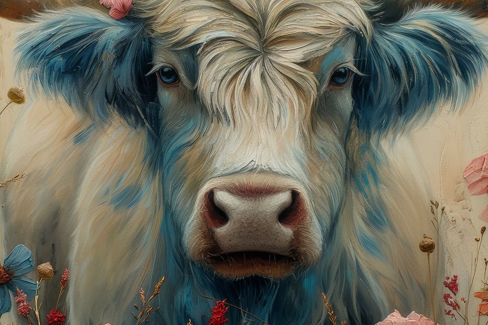 "Floral Majesty" shows an impressive Scottish highlander adorned with soft flowers in her coat, surrounded by colourful blossoms in shades of pink, blue and purple. The graceful combination of the robust horns and delicate flowers creates a harmonious contrast between strength and tenderness. This artwork exudes rural charm and beautifully brings the purity of nature to life, perfect for lovers of both animals and flora.