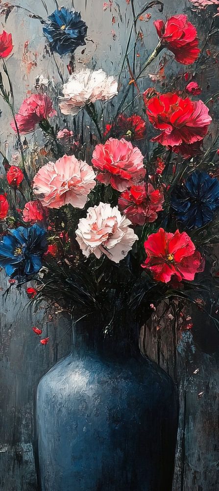 Details: still life, flowers, vase, red, blue, abstract, modern, canvas, art, decor
