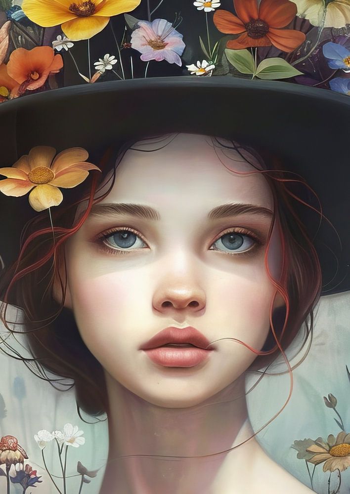 Floral Portrait | Whispering Blooms - This portrait painting shows a young woman surrounded by a multitude of wild flowers and butterflies, creating a vibrant and dreamy atmosphere.