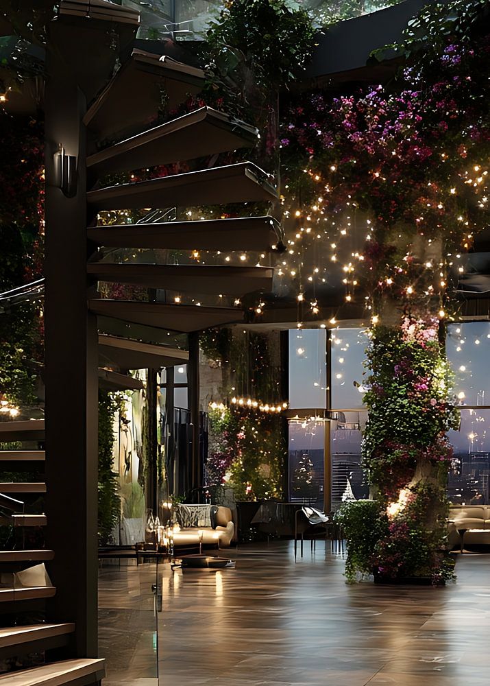 This picture shows an elegant spiral staircase that blends harmoniously into a luxurious setting that is virtually embraced by plants and flowers. The walls and pillars are lavishly covered with floral elements, fairy lights hang between vines and flowers and conjure up a warm, fairytale atmosphere. The soft evening light of a modern cityscape falls through the large windows. The scenery is almost surreal - like a botanical palace in the heart of a metropolis.