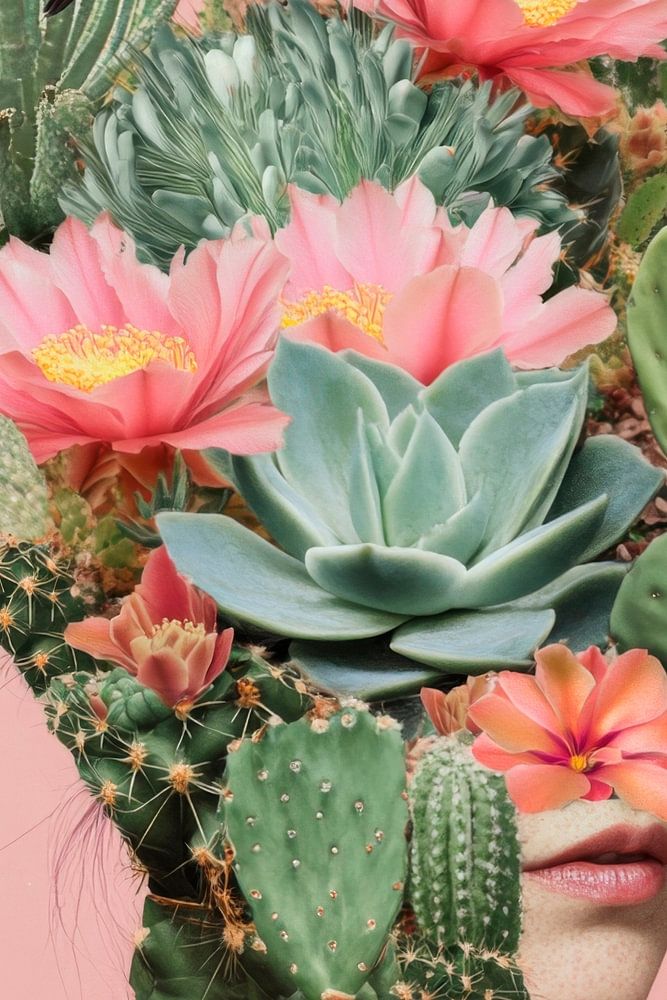 A lively sea of pink lotuses and green succulents merges with a human silhouette. A small bird perched majestically on a cactus-like head. This harmonious combination of nature and humanity invites you to dream and creates a magical symbiosis between flora and spirit.