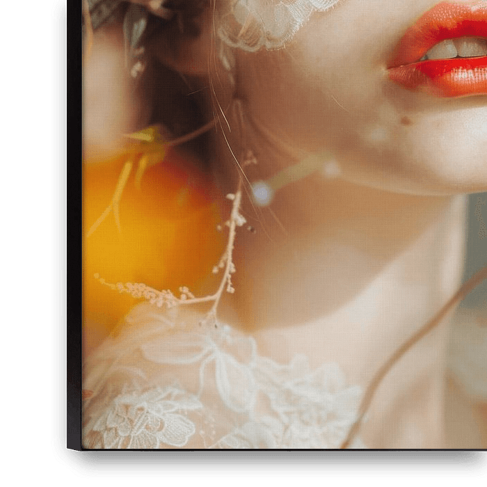 The picture shows a fascinating portrait of a woman whose eyes are covered with delicate lace and flowers. Her bright red lipstick stands out impressively and harmonises with the floral headdress. The soft colours of the flowers and the playful details lend the scene a dreamy and mystical atmosphere.