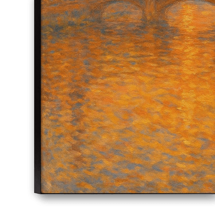This radiant artwork celebrates Florence at its most magical moment: sunset over the historic Ponte Vecchio. Bathed in molten gold and fiery orange light, the Arno River becomes a shimmering mirror reflecting the warmth of the Tuscan sun. The iconic bridge, with its charming shops and timeless arches, stands proudly at the heart of the composition, glowing as if illuminated from within.