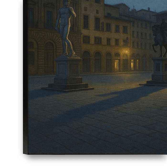 Florence Twilight Serenity unfolds in the heart of Tuscany, where the Piazza della Signoria rests in the blue hour’s fragile light. The statues of David and Cosimo stand sentinel as the city’s golden windows flicker awake. Shadows stretch across the ancient stones like echoes of centuries gone by.
