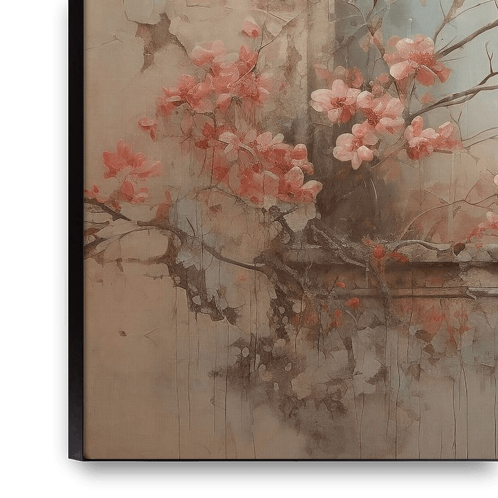 Cast a glance at this captivating composition, where the weathered wall witnesses transience, while a bush with beautiful pink flowers in front of it breathes a breath of new life.