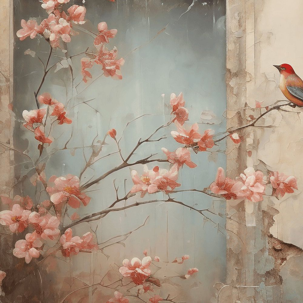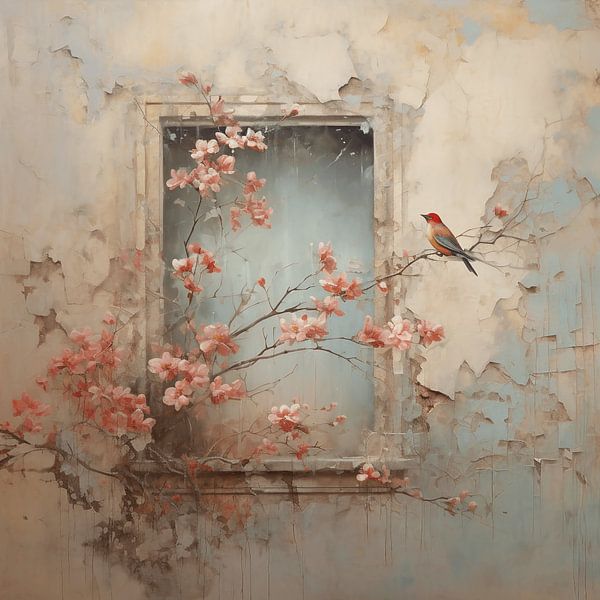 Buy this bird art Flourishing Window to the Past by Karina Brouwer on canvas, ArtFrame, poster and wallpaper, printed on demand in high quality.