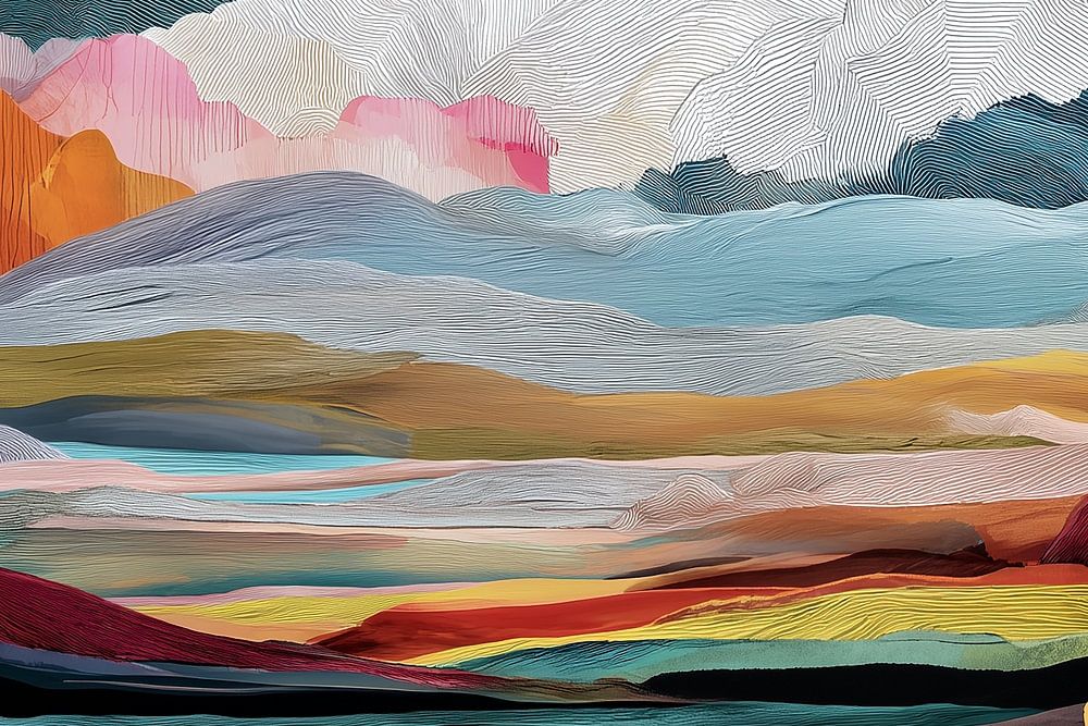 This work depicts an abstract landscape in which colour, movement and nature intertwine. The image is composed of multiple layers of colour that move across the surface like soft, organic strips. At the base are warm and cool hues - yellow, green, red, orange, pink, purple and grey - that do not sharply delineate each other, but come…