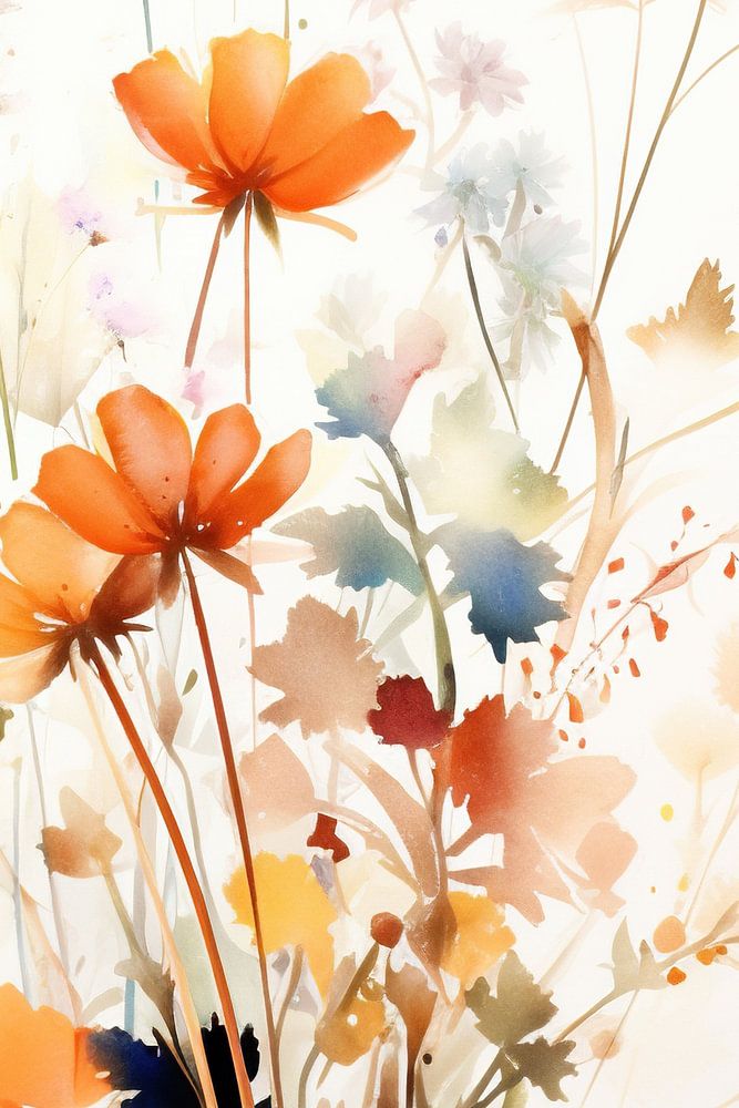Field of Flowers - The work depicts a tender bouquet of flowers and leaves in pastel colours and warm Peach Fuzz tones, subtle and fresh. Using a watercolour approach, the painting creates an airy and natural atmosphere, with a single butterfly adding to the vibrancy of the scene.