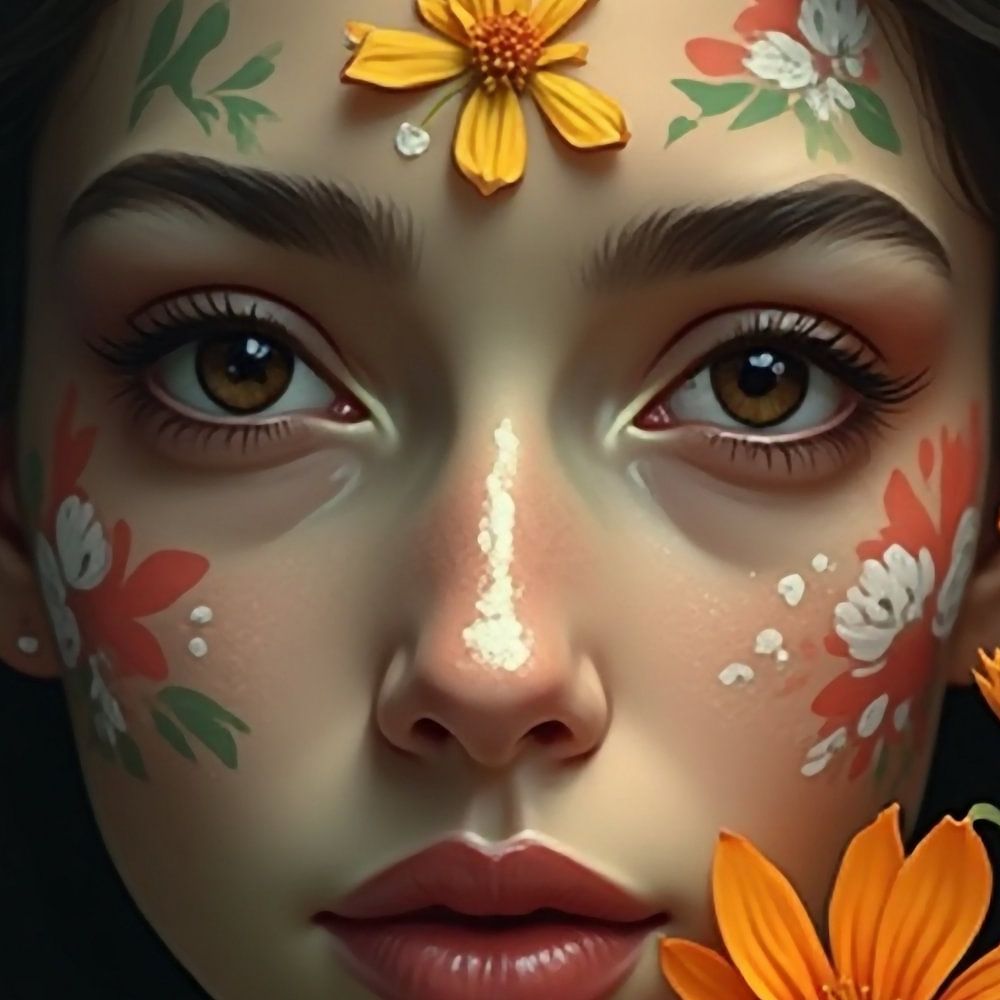 This painting depicts an intriguing woman's face decorated with an artful painting of flowers on her skin, complemented by vibrant orange flowers that enhance her beauty and expression. The combination of nature and art creates a magical and elegant look, perfect for an interior that appreciates creative flair and sophisticated aesthetics.