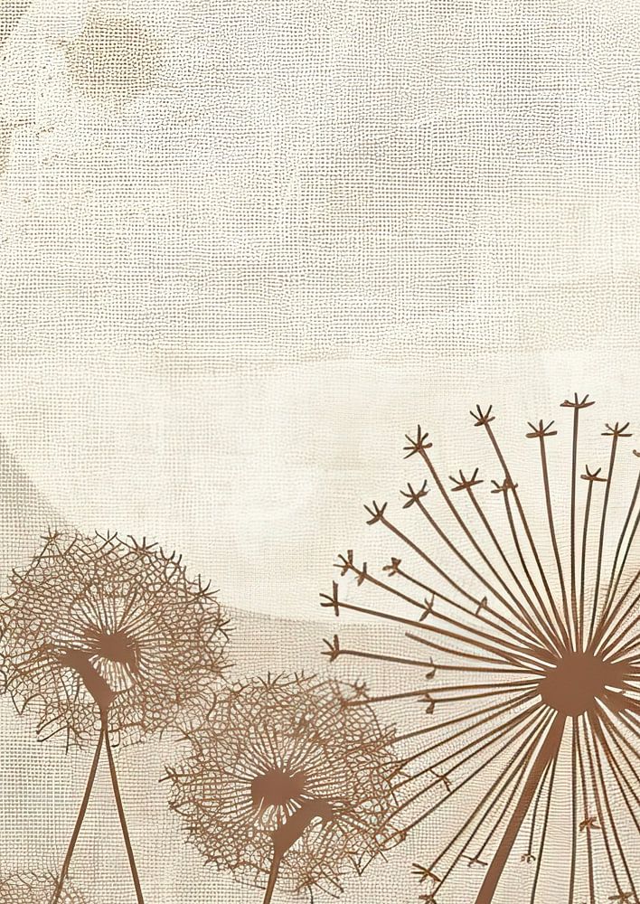 Flower Painting | Lunar Bloom Symphony - This minimalist nature painting shows five delicate floral still lifes in front of a large moon. The flowers, with long, slender stems, show finely branched inflorescences, one of which is particularly prominent in the centre, like a dynamic star with many thin, protruding points. The colour scheme is restrained, with warm shades of beige and brown against a subtly textured background, imitating the texture of scrap paper. The large, round moon in the background is not completely plain; its surface is blotchy with subtle differences in white and beige, adding depth to the whole. This artwork exudes a calm, almost meditative atmosphere, underlined by the sophisticated balance and symmetry of the flowers against the calm sky.
